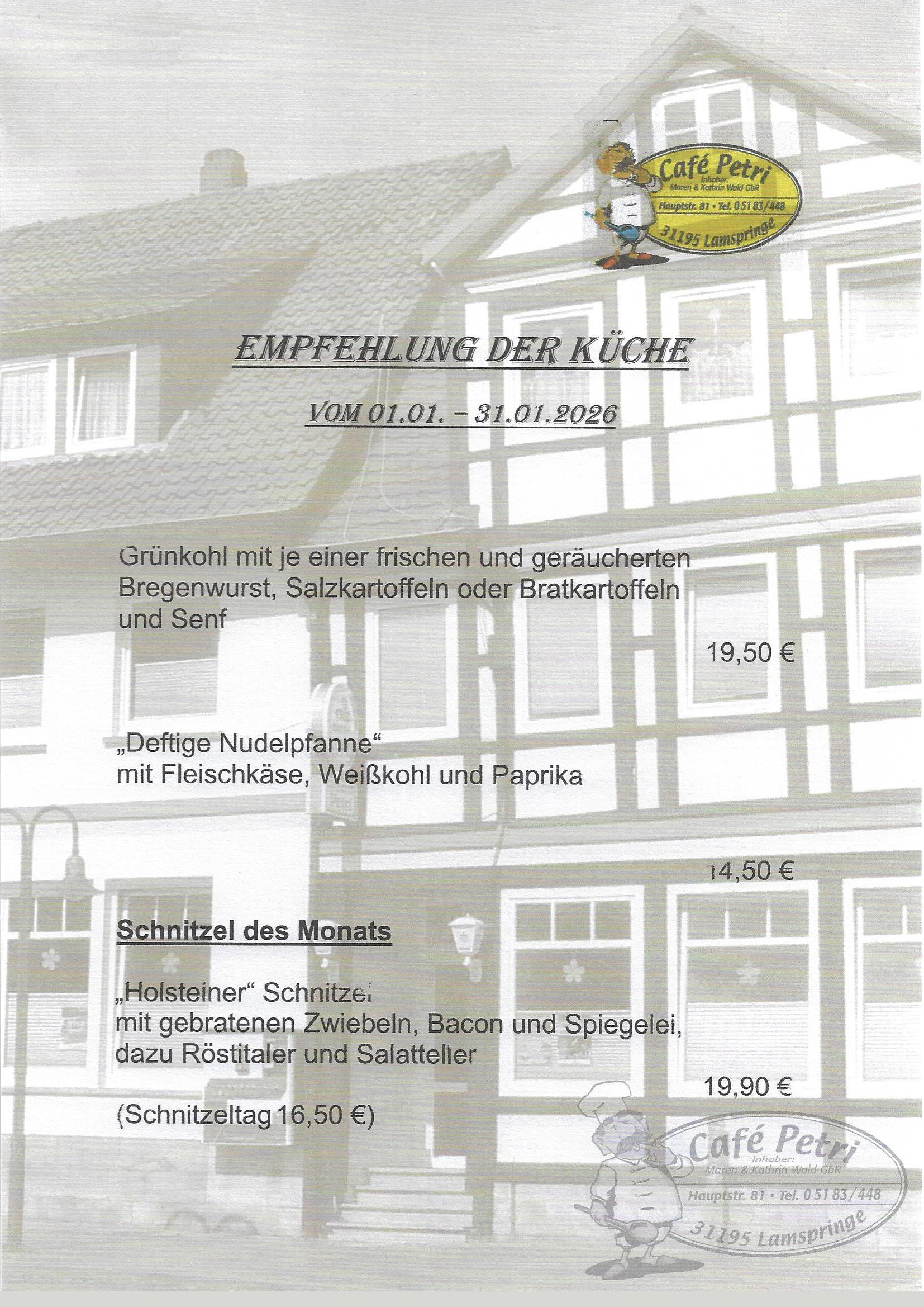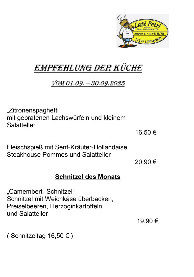 Das Café Petri bietet ihnen eine große Auswahl an verschiedenen Gerichten wie z.B. „Lamspringer Schnitzel“ oder eine Auswahl aus unserer Monatskarte.